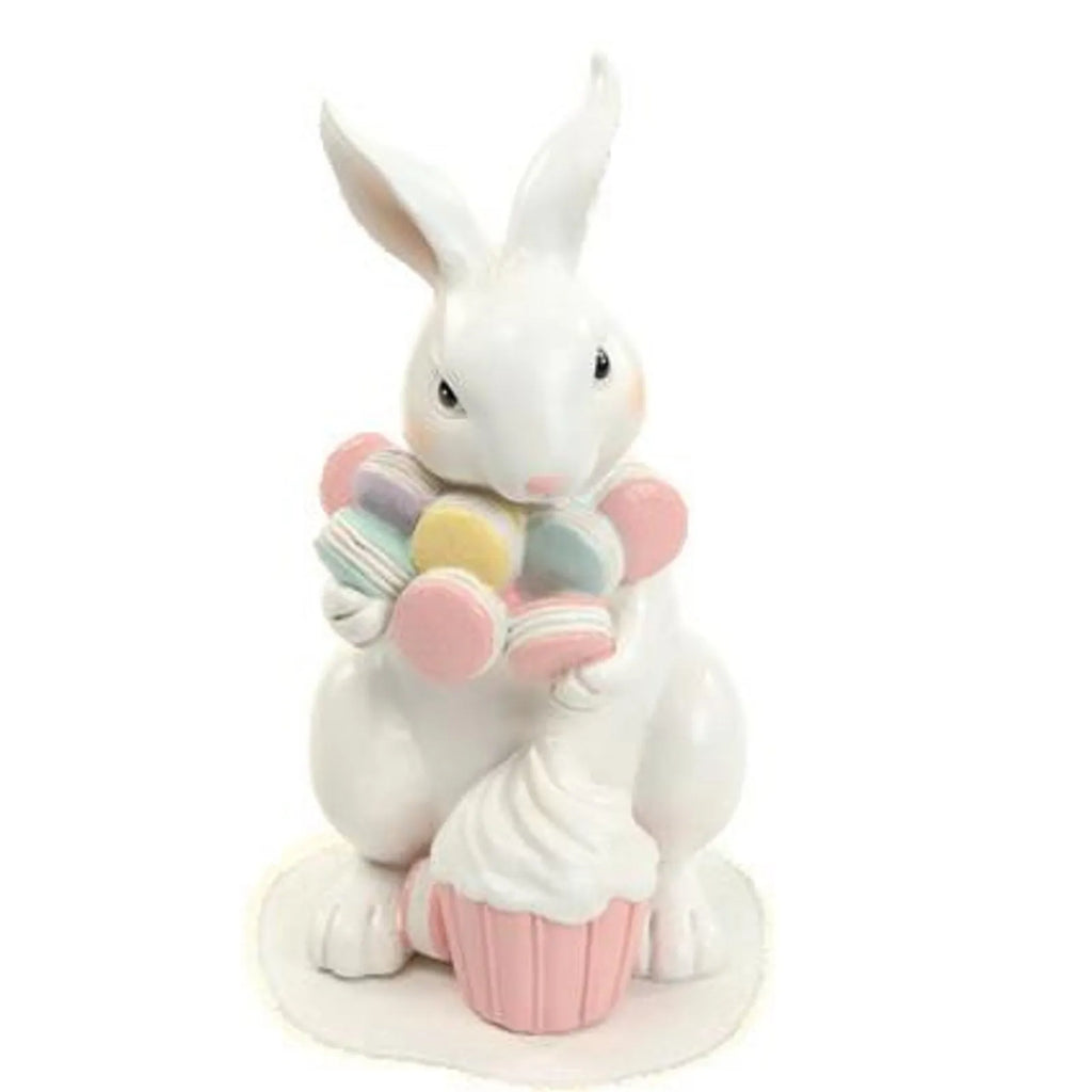 Um encantador coelhinho segurando macarons e um cupcake, perfeito para trazer um toque lúdico e sofisticado à sua decoração. Com detalhes delicados e acabamento refinado, essa peça é ideal para enfeitar mesas, cozinhas, confeitarias e espaços temáticos, especialmente na Páscoa.